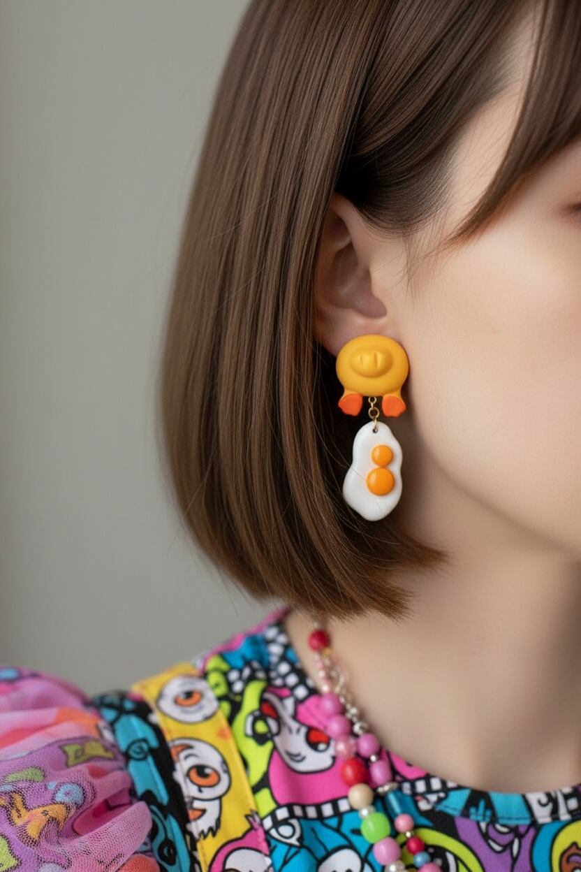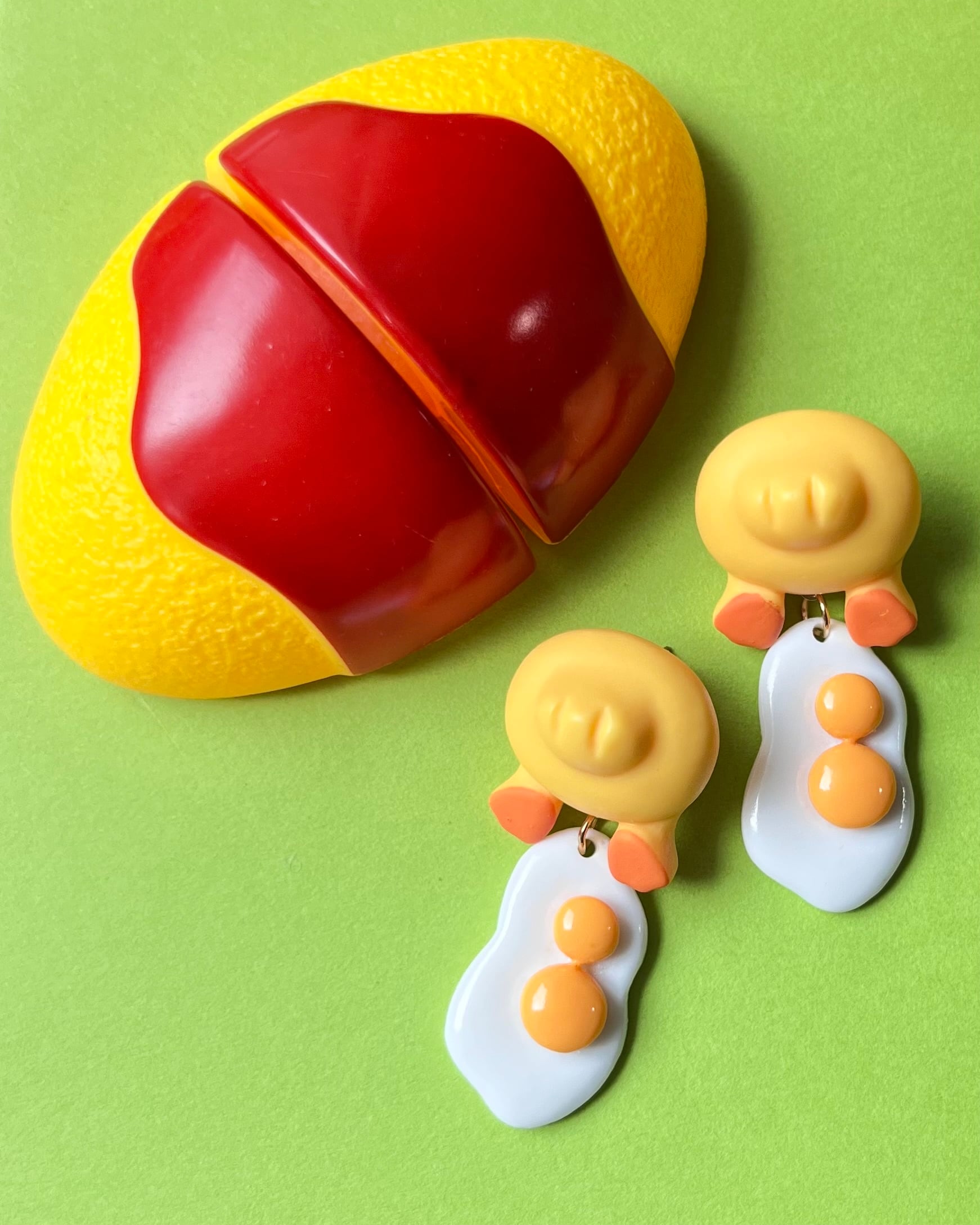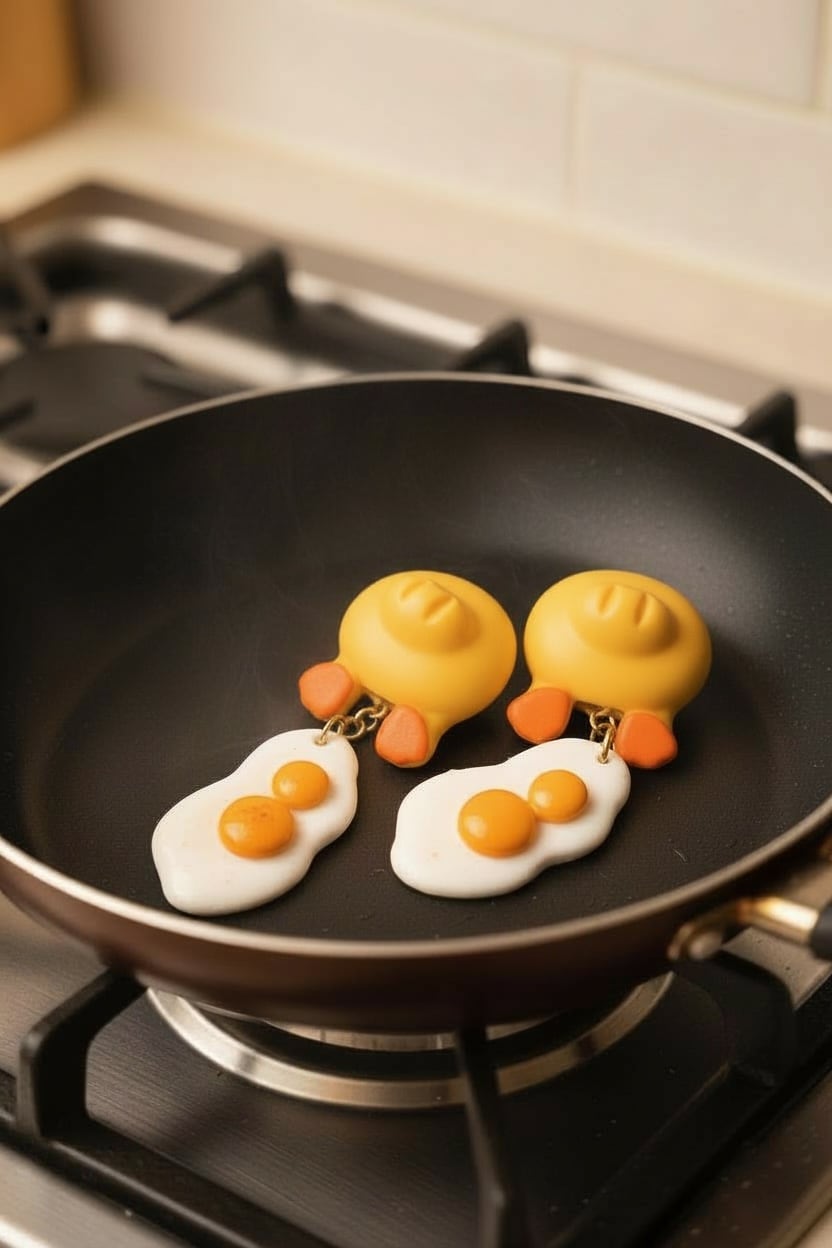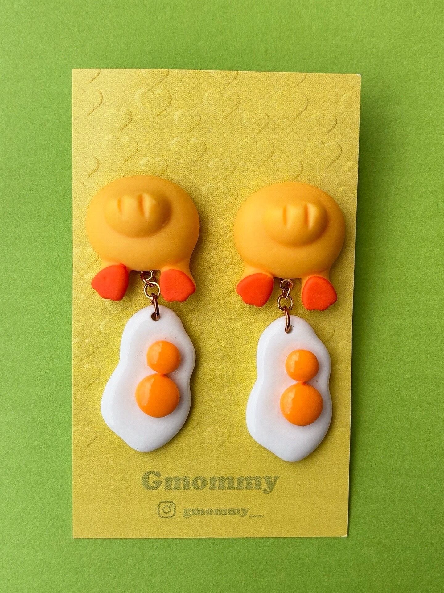 まんまるかわいいひよこのお尻の下に、双子の目玉焼きがぷらぷら揺れるユニークなデザイン。