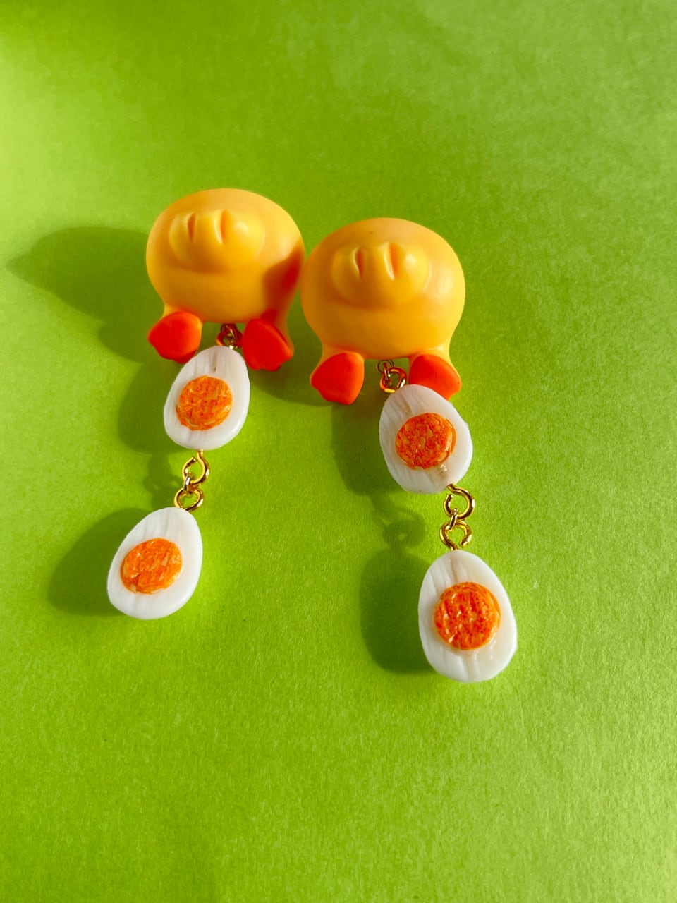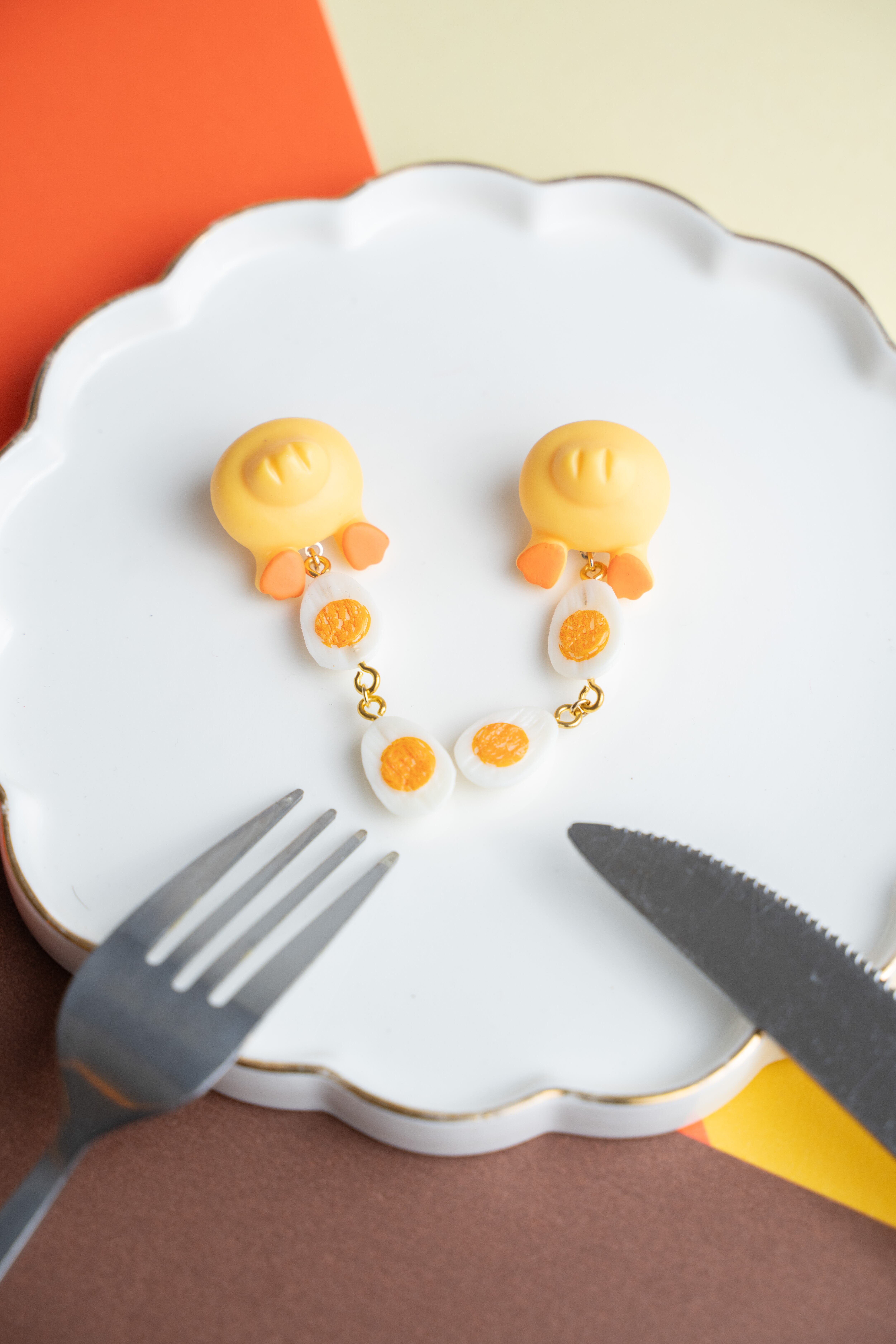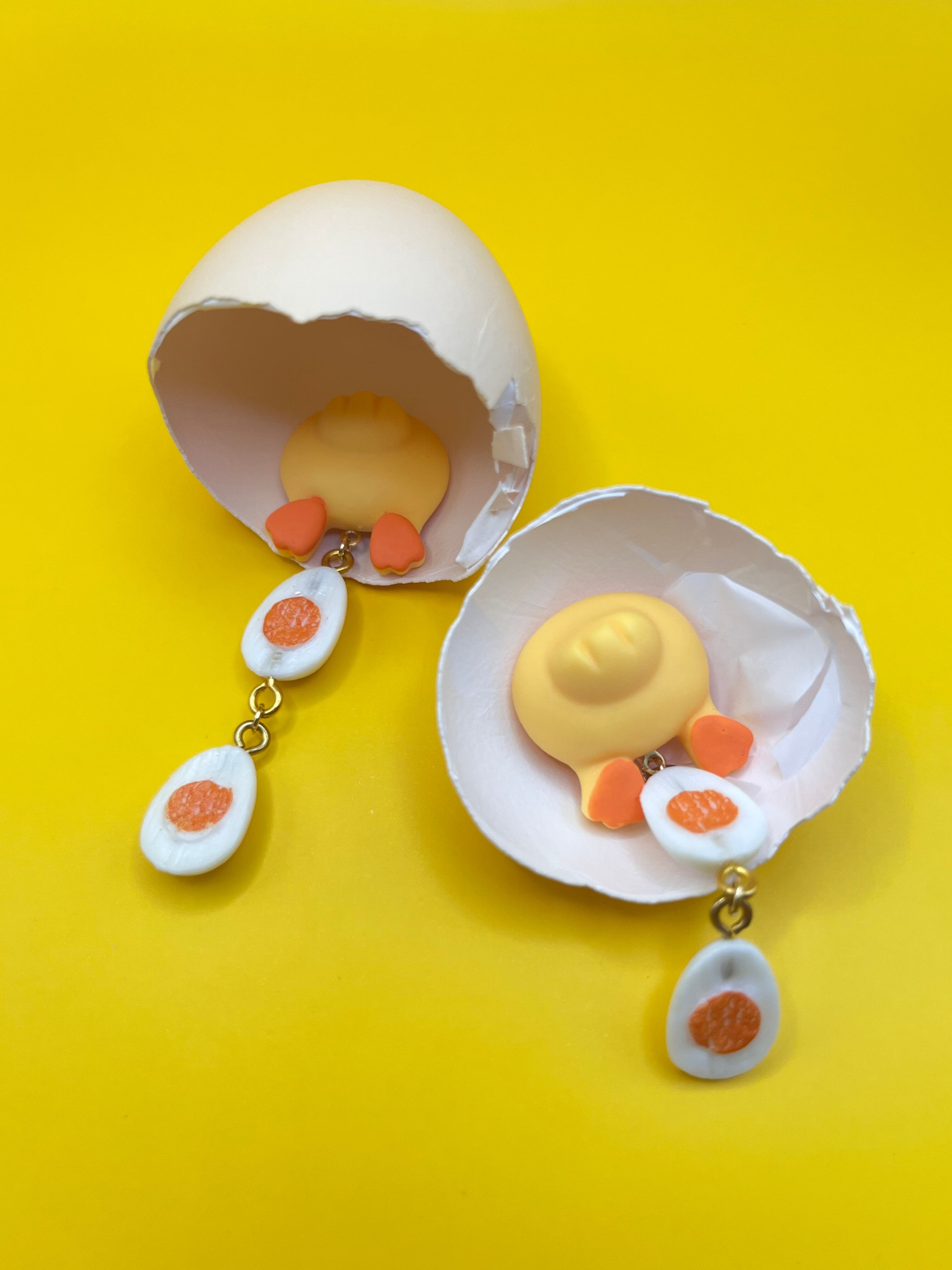 ゆでたまごとひよこがセットになった、ちょっと不思議でかわいい妄想ピアスです。