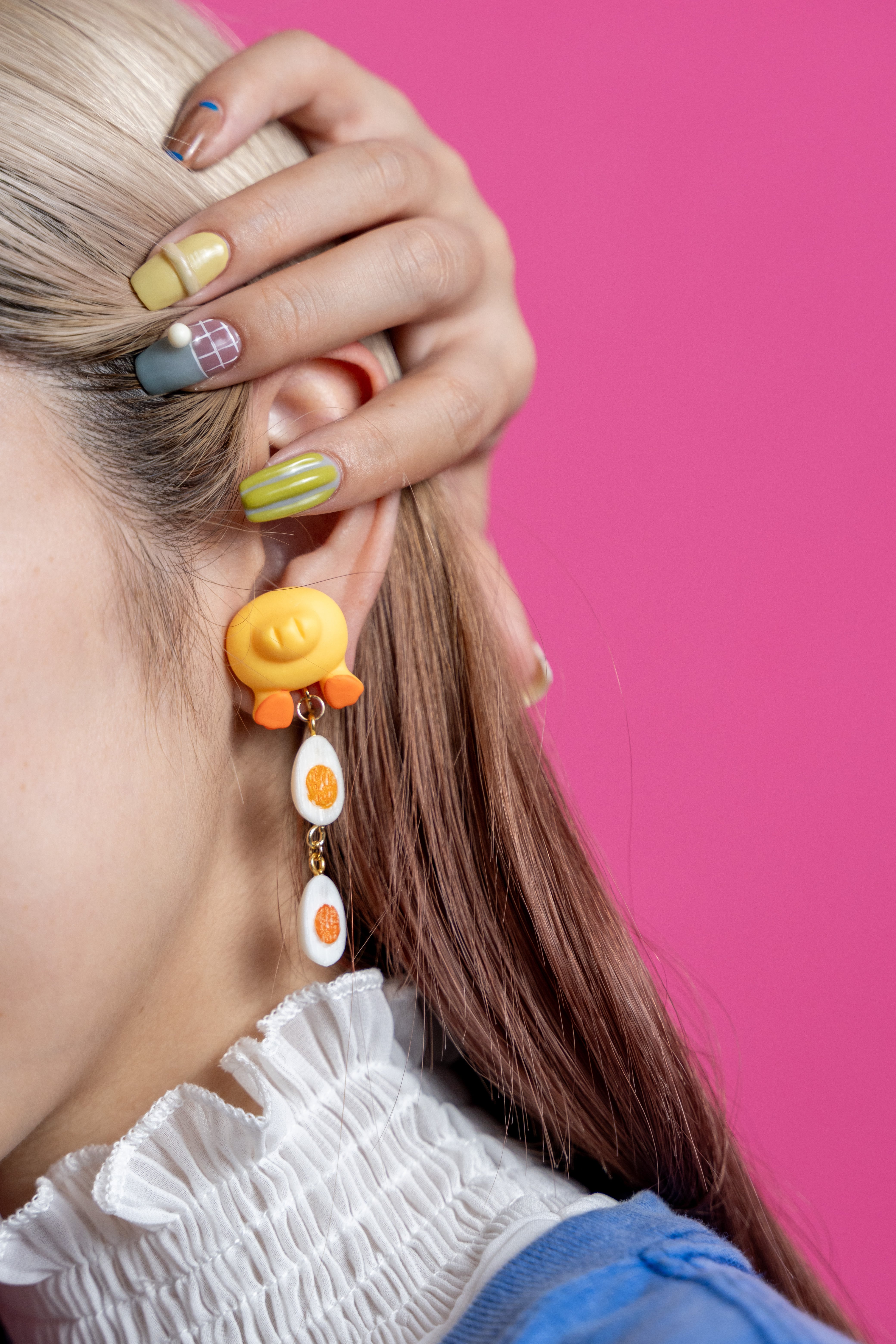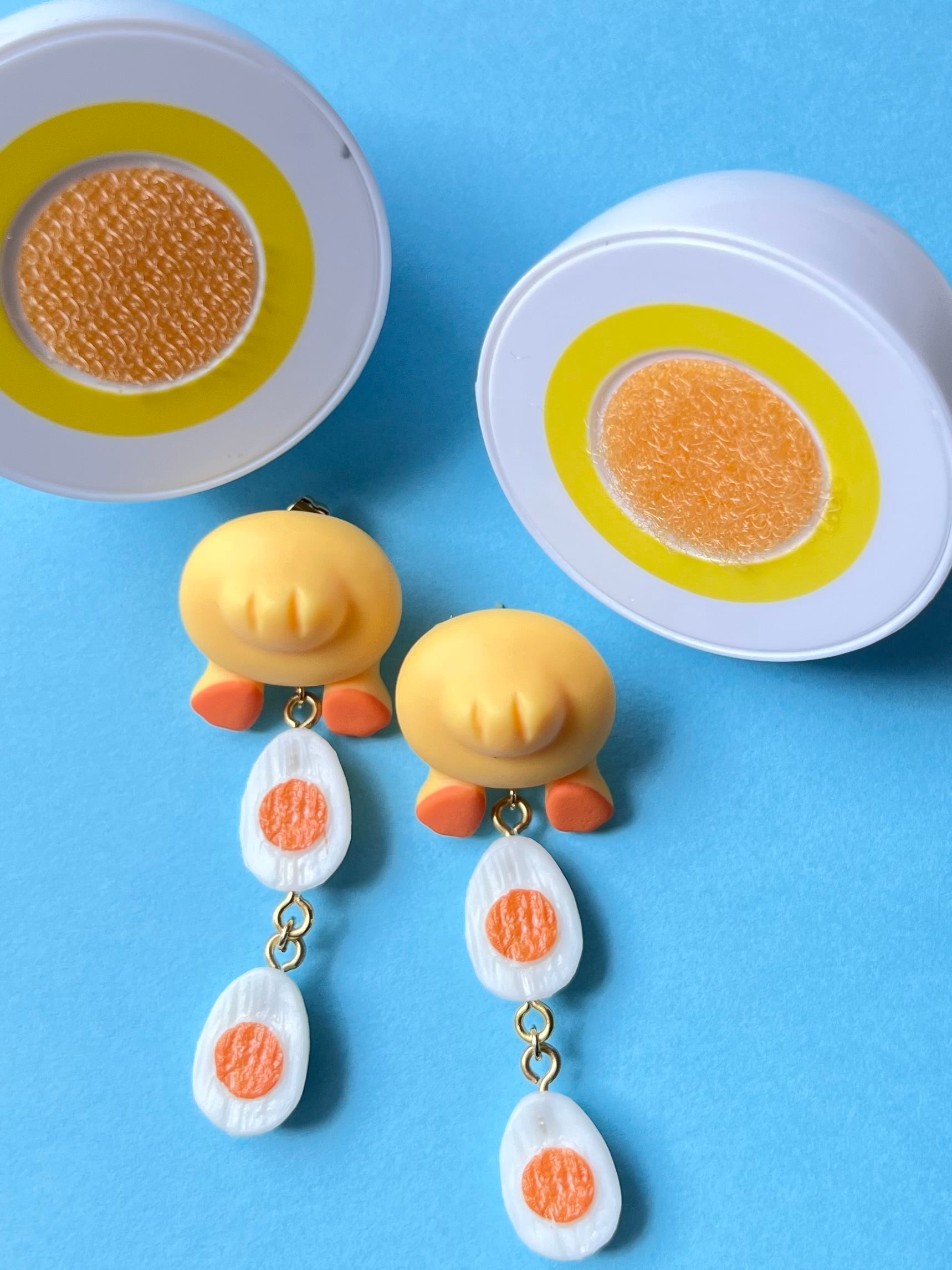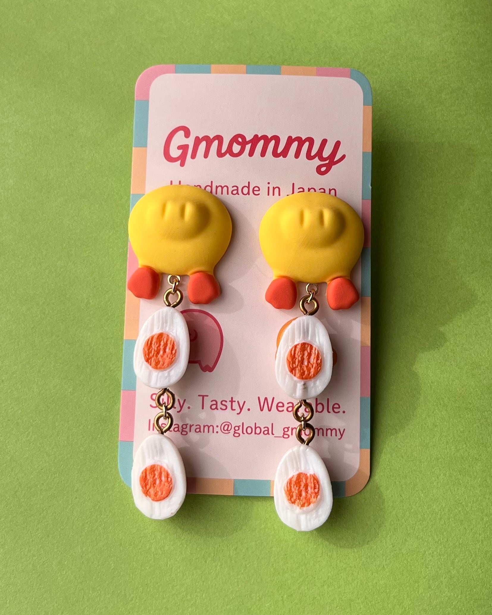 ゆでたまごとひよこがセットになった、ちょっと不思議でかわいい妄想ピアスです。
